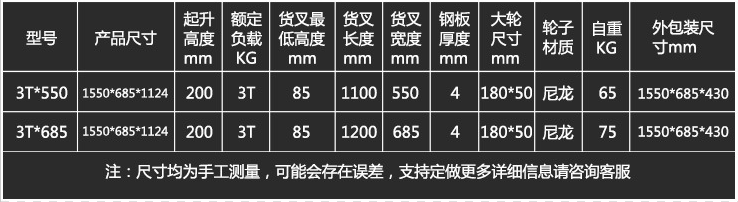 搬運(yùn)車分為兩種型號(hào):550型和685型,其具體的相關(guān)尺寸見上圖所示。其輪子也分為2種,一種是尼龍輪,一種是橡膠輪。尼龍輪適合水泥地面,橡膠輪適合大理石、油漆、環(huán)氧地面。